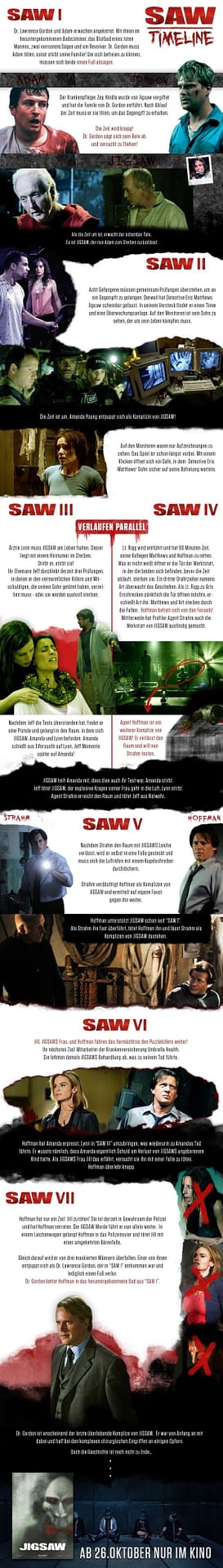 2004 krempelte Saw das gesamte Horror-Genre um und avancierte schnell zum absoluten Kultfilm. Bis heute folgten sieben Fortsetzungen, die das Leben und blutige Werk des Jigsaw-Killers und seinen Komplizen weiter erzählten. Das letzte Werk, Jigsaw, startete 2017 in den Kinos.